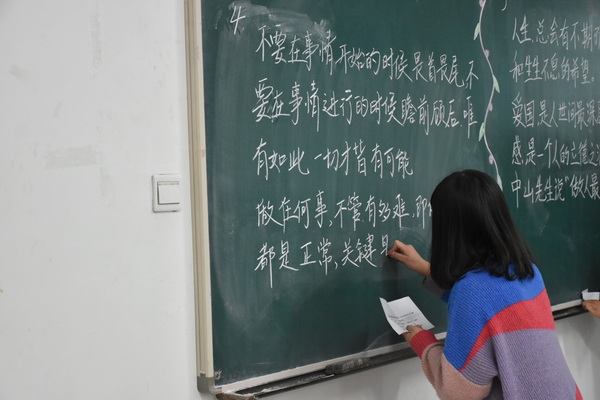 男男做爱 一直致力于学生全面发展,重视学风建设,开展了以就业质量提升为目的的第二课堂活动,安排专业老师为同学们练习板书、普通话、讲课技能进行指导。此次活动为同学们提供了相互切磋、展示自我的平台,加深了同学们对书法的认识和了解,提升了同学们的艺术修养和审美能力。